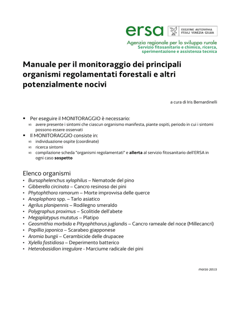 Servizio fitosanitario e chimico, ricerca, sperimentazione e assistenza tecnica Manuale per il monitoraggio dei principali organismi regolamentati forestali e altri potenzialmente nocivi a cura di Iris Bernardinelli Per eseguire il MONITORAGGIO è necessario: • avere presente i sintomi che ciascun organismo manifesta, piante ospiti, periodo in cui i sintomi possono essere osservati Il MONITORAGGIO consiste in: • • • individuazione ospite (coordinate) ricerca sintomi compilazione scheda "organismi regolamentati" e allerta al servizio fitosanitario dell’ERSA in ogni caso sospetto Elenco organismi • • • • • • • • • • • • Bursaphelenchus xylophilus – Nematode del pino Gibberella circinata – Cancro resinoso dei pini Phytophthora ramorum – Morte improvvisa delle querce Anoplophora spp. – Tarlo asiatico Agrilus planipennis – Rodilegno smeraldo Polygraphus proximus – Scolitide dell’abete Megaplatypus mutatus – Platipo Geosmithia morbida e Pityophthorus juglandis – Cancro rameale del noce (Millecancri) Popillia japonica – Scarabeo giapponese Aromia bungii – Cerambicide delle drupacee Xylella fastidiosa – Deperimento batterico Heterobasidion irregulare - Marciume radicale dei pini marzo 2015 NEMATODE del PINO Bursaphelenchus xylophilus Posizione tassonomica: • Nematode • Tylenchida • Fam. Aphelenchoididae Origini: America Dove è stato segnalato: Giappone; Cina; Portogallo; Spagna Piante ospiti: diverse specie di Pinus (in particolare Pinus nigra, Pinus sylvestris, Pinus pinaster) ma anche Abies, Cedrus, Larix, Picea, Pseudotsuga, Tsuga Il nematode è in grado di colonizzare anche autonomamente nuove piante purché presenti alcune condizioni: • • • nematodi vivi acqua ferite o lesioni Misure fitosanitarie • • • • Decreto legislativo 19 agosto 2005, n. 214, relativo all’attuazione della direttiva 2002/89/CE Standard tecnico, emanato ai sensi dell’articolo 49, comma 2, lettera (c), del D.Lgs. 214/2005 Decisione di esecuzione della commissione 2012/535/UE del 26 settembre 2012 Decreto ministeriale 28 marzo 2014 Recepimento della decisione di esecuzione della commissione 2012/535/UE Monitoraggio Cosa guardare Quando Avvizzimento, ingiallimento o arrossamento degli aghi Tutto l’anno (ricordandosi che in alcuni periodi gli aghi più vecchi cadono naturalmente) Presenza di fori e gallerie di cerambicidi (del genere Monochamus – fori di uscita circolari con diametro superiore a 0,5 cm) Azzurramenti legno Tutto l’anno Tutto l’anno (su piante tagliate) Dove è meglio guardare Pinete o altri boschi con presenza di piante del genere Pinus nel raggio di 5 km da: • punti di entrata (porti, aeroporti, confini) • segherie • depositi di legname • centri di lavorazione di legname (importato) • importatori di merci in imballaggi in legno e luoghi di stoccaggio di merci imballate in legno (da paesi dove il nematode è presente) 2 E anche su piante di pino o altre conifere: • presenti lungo coste e confini di stato • nei siti di taglio e trasporto conifere • in vivai forestali • in alberi fuori da foreste (es. parchi, giardini, alberature stradali) • presenti in cortili di imprese che lavorano legnami • in siti intorno a punti di importazione logistica e stoccaggio legname K. Venn, Bugwood.org USDA Forest Service - North Central Research Station Archive, USDA Forest Service, Bugwood.org L.D. Dwinell, USDA Forest Service, Bugwood.org William M. Ciesla, Forest Health Management International, Bugwood.org 3 CANCRO RESINOSO dei PINI Gibberella circinata Posizione tassonomica: • Fungi • Ascomycota • Fam. Nectriaceae Origini: America? Dove è stato segnalato: N-America (Messico, USA); S-America (Cile); Spagna? Piante ospiti: oltre 30 specie di Pinus (compresi i pini presenti in Europa) e Pseudotsuga menziesii Misure fitosanitarie La decisione 2007/433/CE - Misure di emergenza per impedire l'introduzione e la diffusione di Gibberella circinata Monitoraggio Cosa guardare Quando Emissione abbondante di resina su fusto o rami Cancri e morte dei rami più piccoli (presenza di resina) e delle giovani piante Avvizzimento, ingiallimento o arrossamento degli aghi Morte giovani piante Terry S. Price, Georgia Forestry Commission, Bugwood.org Tutto l’anno Tutto l’anno Tutto l’anno Tutto l’anno (ricordandosi che in alcuni periodi gli aghi più vecchi cadono naturalmente) Donald Owen, California Department Joseph O'Brien, USDA Forest Service, Bugwood.org of Forestry and Fire Protection, Bugwood.org 4 MORTE IMPROVVISA delle QUERCE Phytophthora ramorum Posizione tassonomica: • Pseudofungi • Oomycetes • Fam. Peronosporaceae Origini: N-America Dove è stato segnalata: vari stati europei tra cui anche l’Italia (solo vivaio) Piante ospiti: Principalemmente Querce, Rododendro, Viburno ma può essere trovata su piante del genere: Larix, Lithocarpus, Rhododendron, Umbellularia, Viburnum, Griselinia, Magnolia, Quercus, Vaccinium. Misure fitosanitarie EPPO - Alert list dal 2001 Monitoraggi nazionali per verificarne l'assenza. Monitoraggio Cosa guardare Quando Morte improvvisa delle querce (o di altre piante ospiti) Emissione di essudati neri o rossastri nella parte basale del fusto Periodo vegetativo Periodo vegetativo (estate) Joseph O'Brien, USDA Forest Service, Bugwood.org 5 TARLO ASIATICO Anoplophora spp. (A. glabripennis e A. chinensis) Posizione tassonomica: • Insetti • Coleoptera • Fam. Cerambycidae Origini: Asia Dove è stato segnalato: in alcune regioni Italiane Piante ospiti: Latifoglie (no Querce) Piante ospiti preferite da Anoplophora glabripennis: • Acero, Olmo, Pioppo, Salice, Betulla, Faggio, Biancospino, Ippocastano Piante ospiti preferite da Anoplophora chinensis: • Acero, Olmo, Pioppo, Salice, Ontano, Carpino, Betulla, Faggio, Biancospino, Nocciolo, Platano, Ippocastano, Corniolo, Rosa Misure fitosanitarie Anoplophora glabripennis • Allegato I parte A della Direttiva 2000/29 CE (DLgs 214