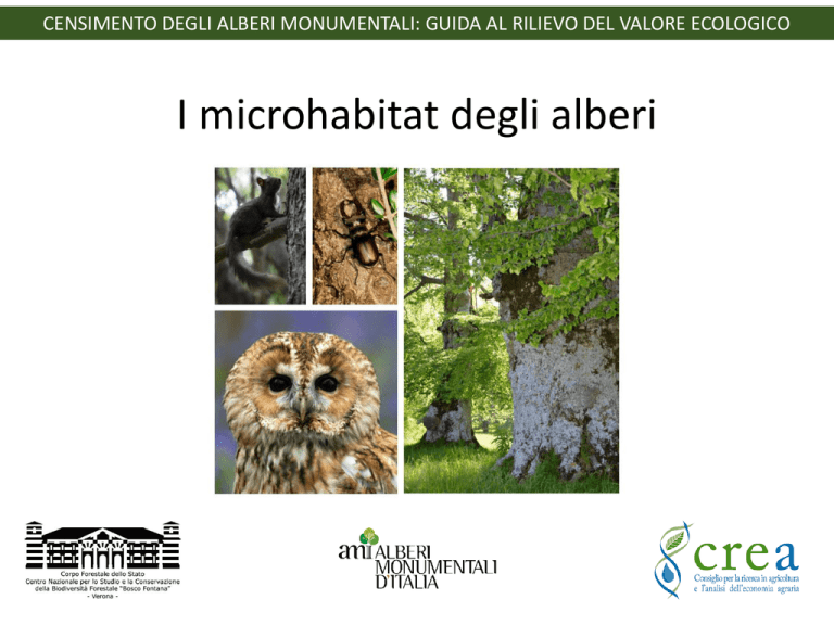 CENSIMENTO DEGLI ALBERI MONUMENTALI: GUIDA AL RILIEVO DEL VALORE ECOLOGICO I microhabitat degli alberi GUIDA AL RILIEVO DEL VALORE ECOLOGICO: MICROHABITAT DEGLI ALBERI Valore ecologico: Decreto 23 ottobre 2014 è relativo alle presenze faunistiche che su di esso si insediano, con riferimento anche alla rarità delle specie coinvolte, al pericolo di estinzione ed al particolare habitat che ne garantisce l’esistenza. L’albero può rappresentare un vero e proprio habitat per diverse categorie animali, in particolare: entomofauna, avifauna, micro-mammiferi. Tale prerogativa si riscontra soprattutto in ambienti a spiccata naturalità, dove la salvaguardia di queste piante rappresenta elemento importante per la conservazione di specie animali rare o di interesse comunitario. MICROHABITAT FAUNA I MICROHABITAT DEGLI ALBERI HABITAT: Luogo dove una pianta o un animale vive o dove compie un singolo stadio del suo ciclo vitale. MICROHABITAT : parte distinta di un albero che ospita insiemi di diverse specie. Cavità nei rami Cavità con acqua Megalopoli arboree: • Ogni microhabitat ospita una particolare comunità di organismi • Organismi adattati sfruttare risorse limitate • Susseguirsi di generazioni a molteplici Cavità nel tronco Legno morto Fuoriuscita di linfa Scortecciamento Corpi fruttiferi Epifite Legno morto Immagine tratta da Davies et al. 2000 I MICROHABITAT DEGLI ALBERI Caratteristiche generali dei microhabitat: 1. Habitat di piccole dimensioni per specie di piccola taglia. 2. Alcuni sono dinamici e cambiano nel tempo: gli abitanti contribuiscono ad innescare questi cambiamenti. C’è una stretta dipendenza fra abitanti & microhabitat. 3. Alcuni sono incredibilmente stabili: temperatura e umidità. 4. Anche se hanno una natura temporanea sono indispensabili ed hanno un ruolo chiave: contribuiscono ad aumentare la biodiversità. I MICROHABITAT DEGLI ALBERI Come identificare i microhabitat? Standardizzare il rilievo dei microhabitat presenti tramite il Catalogo dei microhabitat degli alberi: • Sviluppato dal Ministero Tedesco dell’Alimentazione e dell’Agricoltura (BMEL) per il progetto INTEGRATE+ http://www.integrateplus.org/ • Compilato da un team europeo di esperti di microhabitat e organismi saproxilici • Disponibile anche come App (in inglese) I MICROHABITAT DEGLI ALBERI Il catalogo include 20 categorie di microhabitat, organizzati con un approccio gerarchico: il livello di dettaglio cambia a seconda di cosa si sta cercando. CV1 CV2 CV3 Cavità CV4 CV5 Microhabitat IN1 Lesioni e saproxilici IN2 Ferite IN3 BA1 Corteccia BA2 Legno morto DW1 Deformazione GR1 GR2 / forme di GR3 crescita Microhabitat Epifite epixilitici Nidi Altro EP1 EP2 EP3 NE1 OT1 OT2 Cavità formate da picidi: CV11, CV12, CV13, CV14, CV15 Cavità del tronco con rosura: CV21, CV22, CV23, CV24, CV25, CV26 Cavità dei rami: CV31, CV32, CV33 Dendrotelmi: CV41, CV42, CV43, CV44 Gallerie scavate da insetti e fori di uscita: CV51, CV52 Scortecciamento, alburno esposto: IN11, IN12, IN13, IN14 Fratture sul tronco e nella chioma: IN21, IN22, IN23, IN24 Fessure e cicatrici: IN31, IN32, IN33, IN34 Tasche nella corteccia: BA11, BA12 Struttura corteccia: BA21 Legno morto nella chioma: DE11, DE12, DE13, DE14, DE15 Cavità nei contrafforti: GR11, GR12, GR13 Scopazzi e riscoppi: GR21, GR22 Cancri: GR31, GR32 Corpi fruttiferi: EP11, EP12, EP13, EP14 Mixomiceti: EP21 Fanerogame e crittogame: EP31, EP32, EP33, EP34, EP35 Nidi: NE11, NE12, NE21 Fuoriuscite di linfa e resina: OT11, OT12 Microsuolo: OT21, OT22 I MICROHABITAT DEGLI ALBERI CV1 CAVITÀ: Cavità formate da picidi • CV11: Diametro d‘ingresso della cavità di 4 cm. Cavità più ampia all’interno. Le cavità scavate da Dendrocopos minor si trovano nei rami della chioma. • CV12: Diametro d’ingresso della cavità di circa 5-6 cm, cavità più ampia all’interno. Picus viridis costruisce le cavità nei tronchi in corrispondenza dell’inserzione di rami spezzati. L’entrata è rotondeggiante. • CV13: Cavità sul tronco scavata da Dryocopus martius. La cavità ha un ingresso con diametro > 10 cm e si allarga all’interno. Il picchio nero costruisce cavità con apertura ovale in tronchi privi di rami. • CV14: Fori scavati di forma conica: l’ingresso è generalmente più largo dell’interno. • CV15: Presenza sul tronco di almeno tre cavità riproduttive di picidi connesse tra loro. Se la connessione non è verificabile: presenza di tre aperture di cavità in meno di 2 m di tronco. I MICROHABITAT DEGLI ALBERI CV1 CAVITÀ: Cavità formate da picidi 4 cm 5-6 cm CV11 CV12 10 cm Il diametro di ingresso e posizione variano a seconda delle specie CV13 CV14: Fori scavati di forma conica L’apertura esterna è più grande dell’interno: fori di alimentazione CV 15: “flauto” Sequenza di più cavita, quella utilizzata è quella più in basso I MICROHABITAT DEGLI ALBERI CAVITÀ: Cavità del tronco con rosura CV2 Tempo Resti animali Non a contatto col terreno A contatto col terreno Ingresso di terreno, foglie, etc. ROSURA: composto costituito da legno marcescente, funghi, resti di animali e resti di nidi. I MICROHABITAT DEGLI ALBERI CAVITÀ: Cavità del tronco con rosura CV2 Cavità nel tronco con rosura, il fondo della cavità è a contatto con il terreno e pertanto l’umidità del suolo raggiunge la cavità. Notare che l’ingresso della cavità può trovarsi più alto sul tronco. • CV21: ø ≥ 10 cm (a contatto con il terreno) • CV21: ø ≥ 30 cm (a contatto con il terreno) Cavità del tronco con rosura non a contatto con il terreno. • CV23: ø ≥ 10 cm • CV24: ø ≥ 30 cm Cavità del tronco semiaperta, con o senza rosura, l’interno della cavità non è completamente protetto dal microclima esterno e può entrare la pioggia. Notare che l’ingresso della cavità può trovarsi più alto sul tronco. • CV25: ø ≥ 30 cm / semiaperta Grande cavità nel tronco aperta alla sommità, con o senza contatto col terreno. • CV26: ø ≥ 30 cm
