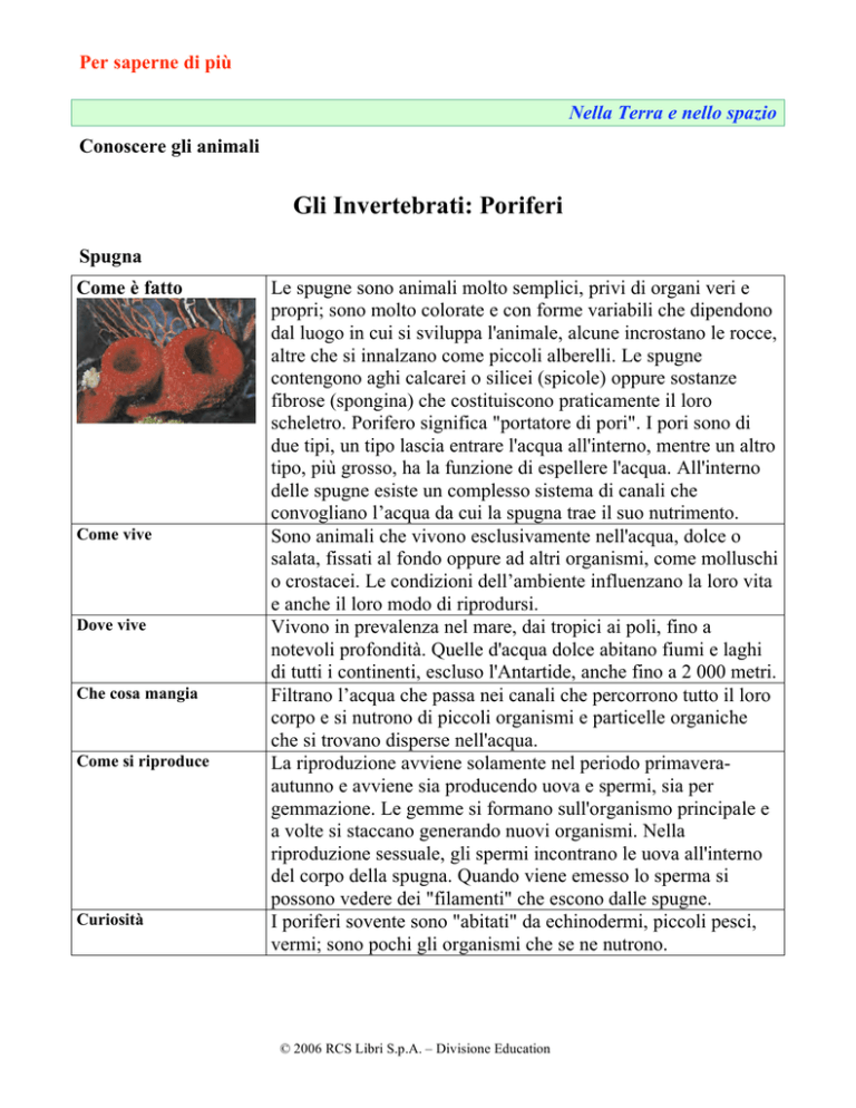 Per saperne di più Nella Terra e nello spazio Conoscere gli animali Gli Invertebrati: Poriferi Spugna Come è fatto Come vive Dove vive Che cosa mangia Come si riproduce Curiosità Le spugne sono animali molto semplici, privi di organi veri e propri; sono molto colorate e con forme variabili che dipendono dal luogo in cui si sviluppa l'animale, alcune incrostano le rocce, altre che si innalzano come piccoli alberelli. Le spugne contengono aghi calcarei o silicei (spicole) oppure sostanze fibrose (spongina) che costituiscono praticamente il loro scheletro. Porifero significa "portatore di pori". I pori sono di due tipi, un tipo lascia entrare l'acqua all'interno, mentre un altro tipo, più grosso, ha la funzione di espellere l'acqua. All'interno delle spugne esiste un complesso sistema di canali che convogliano l’acqua da cui la spugna trae il suo nutrimento. Sono animali che vivono esclusivamente nell'acqua, dolce o salata, fissati al fondo oppure ad altri organismi, come molluschi o crostacei. Le condizioni dell’ambiente influenzano la loro vita e anche il loro modo di riprodursi. Vivono in prevalenza nel mare, dai tropici ai poli, fino a notevoli profondità. Quelle d'acqua dolce abitano fiumi e laghi di tutti i continenti, escluso l'Antartide, anche fino a 2 000 metri. Filtrano l’acqua che passa nei canali che percorrono tutto il loro corpo e si nutrono di piccoli organismi e particelle organiche che si trovano disperse nell'acqua. La riproduzione avviene solamente nel periodo primaveraautunno e avviene sia producendo uova e spermi, sia per gemmazione. Le gemme si formano sull'organismo principale e a volte si staccano generando nuovi organismi. Nella riproduzione sessuale, gli spermi incontrano le uova all'interno del corpo della spugna. Quando viene emesso lo sperma si possono vedere dei "filamenti" che escono dalle spugne. I poriferi sovente sono "abitati" da echinodermi, piccoli pesci, vermi; sono pochi gli organismi che se ne nutrono. © 2006 RCS Libri S.p.A. – Divisione Education Per saperne di più Nella Terra e nello spazio Conoscere gli animali Gli Invertebrati: Celenterati Anemone di mare Come è fatto Dove vive Che cosa mangia Come si riproduce Curiosità L'anemone è come un sacchetto che sta attaccato al fondo marino mediante un piede adesivo, il corpo a colonna termina con un disco che si apre e si chiude, la bocca. Attorno alla bocca ci sono i tentacoli disposti a corona e dotati di cellule urticanti. Un pelo sensibile sporge dalle cellule urticanti verso l'esterno e appena viene sfiorato da un corpo estraneo, fa scattare la cellula che spinge fuori un filamento con le ghiandole velenifere da iniettare nelle carni della preda. Il veleno agisce sul sistema nervoso paralizzando le prede. Il sistema digerente è molto semplice, il cibo dalla bocca va a finire direttamente nello stomaco e ciò che non viene assimilato è ributtato fuori sempre attraverso la bocca. Il sistema nervoso è molto primitivo, non ha un cervello ma nervi sensori diffusi nel corpo che si limitano a reagire agli stimoli. Il corpo è di colore bruno-rosato con striature bianche o verdastre. È diffuso nei bassi fondali corallini o rocciosi dell’Oceano Indiano e Pacifico. Si attacca a fondi rocciosi o comunque duri, a volte può trasferirsi alla ricerca di una collocazione più favorevole. Vive solo a temperature superiori ai 25 °C. Gradisce alimenti di origine animale e anche prede vive, il cibo deve giungere a contatto dei tentacoli. La riproduzione può avvenire per scissione, cioè l’anemone di divide in due parti in senso trasversale, oppure mediante il ciclo riproduttivo tipico della specie (vedi medusa). Tra i tentacoli dell’anemone stazionano spesso i pesci pagliaccio perché si aiutano a vicenda: il pesce pagliaccio si nutre degli avanzi dell’anemone, in cambio l’anemone lo difende dai suoi nemici con il suo veleno. © 2006 RCS Libri S.p.A. - Divisione Education 1 Per saperne di più Medusa Come è fatto Come vive Dove vive Che cosa mangia Come si riproduce Curiosità Il corpo della medusa è una specie di sacco, le sue pareti sono costituite da cellule che hanno il compito di digerire gli alimenti. Al centro c’è un’unica apertura, la bocca, circondata da tentacoli che convogliano il cibo verso di essa; la bocca permette anche l’uscita del cibo. Per alcuni periodi, il sacco è ancorato al suolo marino con i tentacoli e la bocca rivolti verso l’alto (polipo); in altri periodi, nuota nell’acqua tenendo bocca e tentacoli rivolti verso il basso (medusa). Questi animali, pur possedendo un modesto apparato muscolare, nervoso e sensoriale, sono pericolosi per gli animali e per l’uomo. La medusa rappresenta una fase della vita dei Celenterati: in questa fase si lascia trasportare dalle correnti marine in cerca di luoghi adatti a soddisfare le sue esigenze. Le meduse e i polipi (non i polpi che sono dei molluschi!) sono due modi di essere dello stesso tipo di animale. La struttura di base è un polipo, che misura non più di 1-2 cm, vive a lungo e può generare altri polipi e delle meduse. Le meduse non sono altro che dei polipi un po’ appiattiti e capovolti, completamente liberi di muoversi. La medusa si differenzia dal polipo, non solo per il fatto di non essere ancorata al suolo, ma anche per la consistenza gelatinosa del corpo, costituito per la maggior parte di acqua. Il diametro della medusa varia dai pochi centimetri sino a due metri.. Popolano tutti i mari e gli oceani a diverse profondità. Le meduse sono dei predatori, si nutrono di crostacei, molluschi, vermi e pesci di varia dimensione. Possiedono delle cellule che producono liquidi urticanti ogni volta che l’animale viene sfiorato. La riproduzione può essere sessuata o asessuata. Quella asessuata può avvenire in due modi: nel primo modo dai polipi solitari, o talvolta dalle meduse, si staccano dei piccoli polipi secondari o delle piccole meduse, nel secondo modo il polipo si riproduce dividendosi in s