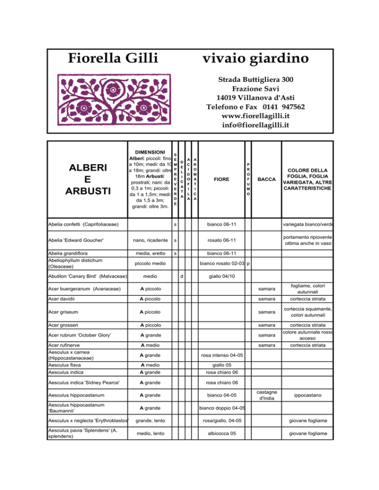 Fiorella Gilli vivaio giardino Strada Buttigliera 300 Frazione Savi 14019 Villanova d'Asti Telefono e Fax 0141 947562 www.fiorellagilli.it [email protected] ALBERI E ARBUSTI DIMENSIONI S Alberi: piccoli: fino E a 10m; medi: da 10 M a 18m; grandi: oltre P R 18m Arbusti: E prostrati; nani: da V 0,3 a 1m; piccoli: E da 1 a 1,5m; medi: R D da 1,5 a 3m; E grandi: oltre 3m. A A D C R E I O L D M I O A C F T A I I T L C A A A FIORE P R O F U M O BACCA COLORE DELLA FOGLIA, FOGLIA VARIEGATA, ALTRE CARATTERISTICHE s bianco 06-11 variegata bianco/verde nano, ricadente s rosato 06-11 portamento ripiovente, ottima anche in vaso Abelia grandiflora media, eretto s bianco 06-11 Abeliophyllum distichum (Oleaceae) piccolo medio Abelia confetti (Caprifoliaceae) Abelia 'Edward Goucher' Abutilon 'Canary Bird' (Malvaceae) medio bianco rosato 02-03 p d giallo 04/10 Acer buergeranum (Aceraceae) A piccolo samara fogliame, colori autunnali Acer davidii A piccolo samara corteccia striata Acer griseum A piccolo samara corteccia squamante, colori autunnali Acer grosseri A piccolo samara corteccia striata Acer rubrum ‘October Glory’ A grande samara colore autunnale rosso acceso Acer rufinerve A medio samara corteccia striata Aesculus x carnea (Hippocastanaceae) A grande castagne d'India ippocastano rosa intenso 04-05 Aesculus flava A medio giallo 05 Aesculus indica A grande rosa chiaro 06 Aesculus indica 'Sidney Pearce' A grande rosa chiaro 06 Aesculus hippocastanum A grande bianco 04-05 Aesculus hippocastanum ‘Baumannii’ A grande bianco doppio 04-05 Aesculus x neglecta 'Erythroblastos' grande, lento rosa/giallo, 04-05 giovane fogliame Aesculus pavia 'Splendens' (A. splendens) medio, lento albicocca 05 giovane fogliame Aloysia triphylla (Lippia citriodora) (Verbenaceae) Amelanchier canadensis (Rosaceae) medio grande d a la "limonina" medio grande bianco 05 grande violetto 06 Anthyllis hermanniae (Leguminosae) nano giallo, estate Arbutus unedo 'Compacta' (Ericaceae) medio Arbutus unedo ‘Rubra’ grande Aronia arbutifolia 'Brilliant' (Rosaceae) Amorpha fruticosa (Leguminosae) Aronia melanocarpa Aronia prunifolia blu,edule colori autunnali bianca 10 corbezzolo rossa, edule corteccia, fioritura contemporanea alla fruttificazione rosa 10 corbezzolo rossa, edule corteccia, fioritura contemporanea alla fruttificazione medio bianco 05 rossa, persistente colori autunnali medio bianco 05 nera colori autunnali piccolo medio bianco 05 bruna colori autunnali s Artemisia 'Powis Castle' (Compositae) piccolo s Berberis candidula (Berberidaceae) piccolo s giallo 04-05 Berberis julianae medio s giallo 04-05 Berberis thumbergii 'Rose Glow' piccolo Betula pendula 'Youngii' (Betulaceae) Buddleja alternifolia (Loganiaceae) a fine fogliame grigio argento giallo p blu rossa fogliame variegato rosso bianco A piccolo,a ombrello grande lilla 06 p tutte le Buddleja attirano le farfalle Buddleja davidii medio viola, estate p grigio Buddleja davidii 'Harlequin' medio viola, estate p verde/bianca Buddleja davidii 'Black Knight' medio viola porpora, estate p grigio Buddleja fallowiana medio grande lavanda, estate p Buddleja fallowiana 'Burlinghton' medio grande bianco, estate p grigio giallo limone, estate p grigio Buddleja globosa 'Lemon Ball' medio Buddeleja lindleyana grande Buddleja 'Lochinch' medio Buxus x 'Green Gem' (Buxaceae) Buxus microphylla 'National' Buxus sempervirens Buxus sempervirens 'Arabeske' Buxus sempervirens 'Elegans' Buxus sempervirens 'Fiesta' viola, estate p grigio blu violetto, estate p grigio fogliame minuto, fitto, verde scuro fogliame minuto, fitto, verde scuro piccolo-lento s grande s grande-lento s ottimo per siepi grande-lento s fogliame minuto, fitto, verde scuro nano s verde/bianca fogliame minuto, fitto, verde scuro accrescimento più rapido fogliame minuto, fitto, glauco grande-lento s grande s Buxus sempervirens 'Newport Blue' grande-lento s Buxus sempervirens 'Pyramidalis' grande-lento s portamento conico grande s rapidissimo, ideale per siepi nano s ideale per siepi basse Buxus sempervirens 'Handsworthensis' Buxus sempervirens 'Raket' Buxus sempervirens 'Suffrutticosa' Callicarpa bodinieri 'Profusion' (Verbenaceae) medio viola, estate viola Callicarpa dichotoma piccolo viola, estate viola Callicarpa japonica 'Leucocarpa' medio bianco, estate bianca Callistemon citrinus ‘Splendens’ (Myrtaceae) medio Calycanthus occidentalis (Calycanthaceae) medio colori autunnali viola rosso, a scovolino, estate s d rosso scuro, 06 p bianco 04 p fiori curiosamente profumati di vino rosso Calycanthus praecox: vedi Chimonanthus praecox Camellia cuspidata (Theaceae) medio s a Camellia japonica in varietà medio s Camellia oleifera medio grande s Camellia sasanqua in varietà medio grande s Caragana arborescens 'Lorbergii' (Leguminosae) medio grande giallo 05 Caragana aurantiaca piccolo giallo 05 Carpenteria californica (Caprifoliaceae) medio vari colori, primavera bianco, primavera p a autunno s d p fogliame sottile, verde chiaro bianco 05-06 Carpinus betulus (Carpinaceae) A medio Splendido albero, adatto anche per siepi alte Carpinus betulus 'Fastigiata' A medio singolare portamento a cono allargato Carpinus japonica A piccolo frutti vistosi ed eleganti Carpinus turczaninowii A piccolo giovani foglie rosse Caryopteris x clandonensis (Verbenaceae) Caryopteris x clandonensis 'Grand Bleu' Caryopteris x clandonensis 'Kew Blue' Catalpa bignonioides (Bignoniaceae) nano piccolo a azzurro 09-10 p grigio nano piccolo a blu intenso 09-10 p grigio nano piccolo a blu 09-10 p grigio A medio bianco, estate A medio bianco, estate giovane fogliame purpureo, quasi nero blu, primavera fogliame sempreverde fitto, verde brillante piccolo medio azzurro 05-10 semisempreverde piccolo azzurro scuro 05-10 semisempreverde Ceanothus delilanus 'Indigo' piccolo azzurro 05-10 semisempreverde Ceanothus delilanus 'Topaz' piccolo medio azzurro scuro 05-10 semisempreverde Ceanothus pallidus 'Marie Simon' piccolo medio rosa 05-10 semisempreverde Catal