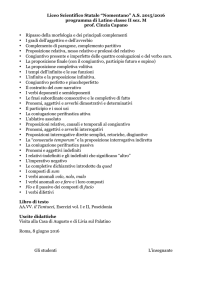 1) A. B. C. D. 2) A. B. C. D. 3) A. B. C. D. 4) A. B. C. D. 5) A. B. C. D. 6) A. B. C. D. 7) A. B. C. D. 8) A. B. C. L’ablativo singolare del nome dies, ‐ei è: @die diem diebus dies Maximus è il superlativo dell’aggettivo: @magnus parvus malus multus Hic, haec, hoc è: @un pronome dimostrativo un pronome relativo un pronome indefinito un pronome personale Legebar è: @imperfetto indicativo passivo imperfetto indicativo attivo imperfetto congiuntivo attivo perfetto congiuntivo passivo Nella frase Omnibus hominibus moriendum est, moriendum est è: @coniugazione perifrastica passiva accusativo del gerundio coniugazione perifrastica attiva supino attivo Nella frase Amemus parentes, il verbo amemus è: @un congiuntivo presente un congiuntivo imperfetto un congiuntivo perfetto un congiuntivo piuccheperfetto La congiunzione quoniam introduce: @una proposizione causale una proposizione temporale una proposizione consecutiva una proposizione suppositiva Il nominativo plurale del nome bellum, ‐i (= la guerra) è: @bella belli belles D. 9) A. B. C. D. 10) A. B. C. D. 11) A. B. C. D. 12) A. B. C. D. 13) A. B. C. D. 14) A. B. C. D. 15) A. B. C. D. 16) A. bellos Il genitivo plurale del nome consul, ‐is (= il console) è: @consulum consulorum consulibus consules Il genitivo singolare (maschile, femminile, neutro) del pronome qui quae quod (= che, il quale) è: @cuius quo cui quos Del verbo laudo ‐as ‐avi ‐atum ‐are (= lodare) laudaverunt è: @l'indicativo perfetto attivo 3° persona plurale l'indicativo futuro attivo 2° persona plurale il congiuntivo perfetto attivo 3° persona plurale il congiuntivo piuccheperfetto attivo 1° persona plurale In latino il complemento di stato in luogo viene espresso di regola con: @la preposizione in + il caso ablativo la preposizione a + il caso ablativo la preposizione per + il caso accusativo la preposizione e + il caso accusativo Indicare modo e tempo della forma verbale manebimus: @indicativo futuro indicativo imperfetto imperativo presente congiuntivo presente Completare la frase Gallia in tres partes divisa ... con una delle seguenti forme verbali: @est sunt fuerunt futurum L’accusativo singolare del nome inventio, ‐onis è: @inventionem inventioni inventione inventiones Puniendus è: @gerundivo B. C. D. 17) A. B. C. D. 18) A. B. C. D. 19) A. B. C. D. 20) A. B. C. D. gerundio infinito supino attivo Nella frase epistulam scripturus sum, scripturus sum è: @coniugazione perifrastica attiva coniugazione perifrastica passiva ablativo assoluto participio congiunto Nella frase laudo hominem qui virtutem amat, qui virtutem amat è: @proposizione relativa proposizione finale proposizione consecutiva proposizione interrogativa Aliquis è: @un pronome indefinito un pronome relativo un pronome interrogativo un aggettivo dimostrativo Il comparativo di clarus è: @clarior clarum clarissimus clari