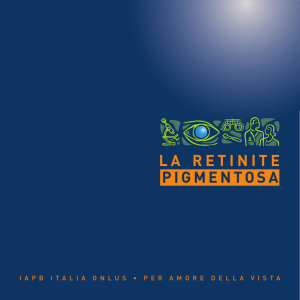 SIPPS &FIMPAGGIORNA 2013 UNIVERSO PEDIATRIA: PROBLEMATICHE OFTALMOLOGICHE CASERTA - 7 MARZO 2013 MALATTIE CAUSA DI IPOVISIONE IN ETÀ PEDIATRICA PROF.SSA FRANCESCA SIMONELLI DIRETTORE CLINICA OCULISTICA SECONDA UNIVERSITÀ DI NAPOLI MALATTIE CAUSA DI IPOVISIONE IN ETÀ PEDIATRICA - Malattia di Stargardt - Retinite pigmentosa - Amaurosi Congenita di Leber MALATTIA DI STARGARDT Definizione La malattia di Stargardt è una degenerazione retinica ereditaria caratterizzata dalla presenza di “ flecks ” giallastre in regione maculare. MALATTIA DI STARGARDT Prevalenz a La malattia di Stargardt è la più frequente distrofia maculare ereditaria. incidenza della patologia Secondo una stima è L ’ esatta sconosciuta. approssimativa la prevalenza è compresa tra 1:4.000 e 1:10.000 MALATTIA DI STARGARDT Modalità di trasmissione La malattia di Stargardt in genere si trasmette con modalità autosomica recessiva, ma in letteratura sono descritti anche casi dominante. a trasmissione autosomica La malattia di Stargardt a trasmissione autosomica recessiva è dovuta alla mutazione del gene ABCA4, localizzato sul braccio corto del cromosoma 1 (1p21-13). MALATTIA DI STARGARDT Patogenesi Il gene ABCA4 codifica per una proteina di trasporto transmembrana espressa a livello del segmento esterno dei fotorecettori. MALATTIA DI STARGARDT Età di insorgenza L’età di insorgenza è tipicamente tra la prima e la seconda decade di vita; tuttavia, sono descritte anche forme ad esordio più tardivo (>20 anni) nel 21-36% delle famiglie affette. MALATTIA DI STARGARDT Sintomatologia Riduzione monolaterale bilaterale. dell’acuità con visiva rapida centrale estensione MALATTIA DI STARGARDT Classificazione morfologica e funzionale Fenotipo Fondo oculare I Piccola area di atrofia foveale associata a flecks perifoveali bianco-giallastre. II Numerose flecks bianco-giallastre a livello del polo posteriore. III Atrofia diffusa dell’epitelio pigmentato retinico. Fishman I Fishman II Fishman III Fundus classification by Fishman et al. (Arch Ophthalmol 1999) MALATTIA DI STARGARDT Classificazione morfologica e funzionale Gruppo Elettroretinogramma Risposta scotopica nella norma ed alterazione della risposta fotopica 3 Anomalie interessanti sia la risposta scotopica che fotopica 300 200 100 0 -100 Amplitude (µV) 2 Amplitude (µV) Risposte scotopiche e fotopiche nella norma. Amplitude (µV) 1 300 200 100 0 -100 0 50 100 150 200 Gruppo 1 200 100 0 -100 -200 -200 -200 300 0 0 50 100 150 50 100 150 200 200 Time (ms) Gruppo 2 Gruppo 3 ERG classification by Lois et al. (Arch Ophthalmol 2001) MALATTIA DI STARGARDT Test Diagnostici • Retinografia • Fluorangiografia • OCT • Elettrofisiologia MALATTIA DI STARGARDT Esami di Follow-up • Autofluorescenza • Microperimetria • ERG-multifocale MALATTIA DI STARGARDT CASI CLINICI VA (RE)20/200 Fundus Fishman I ERG (RE) Group 1 300 Amplitude (µV) Family: MF ABAC4: mut. G1961E/R2030X Age: 12 years 200 100 0 - 100 - 200 0 50 100 150 200 Family: SC VA (RE) 20/1000 ABCA4: mut. N96H/GIVS+5A Fundus Fishman III age: 26 years ERG (RE) Group 3 3 00 Amplitude (µV) 2 00 1 00 0 - 10 0 - 20 0 0 50 100 Time (ms) 150 200 175 µm Family: LA Age: 15 years ABCA4: mut. N965S G1961E VA (RE): 20/1000 3 00 Amplitude (µV) 2 00 1 00 0 - 10 0 - 20 0 0 50 100 Time (ms) 150 2 00 76 76 Family: RR VA (RE): 20/600 ABCA4: mut. V250InsCAAA/V767D Fundus: Fishman III age: 18 years ERG (RE): Group 3 3 00 Amplitude (µV) 2 00 1 00 0 - 100 - 200 0 50 100 Time (ms) 150 200 85 MALATTIA DI STARGARDT Terapia Luteina Pigmento maculare, (luteina e zeaxantina), contribuisce alla protezione della macula attraverso l’assorbimento passivo dei raggi luminosi a più breve lunghezza d ’ onda. L ’ esposizione alla luce non solo provoca l’accumulo di A2E, ma aumenta anche la potenziale tossicità di A2E accumulatosi per processi fotoossidativi. MALATTIA DI STARGARDT La supplementazione con vitamina A andrebbe evitata in pazienti con mutazioni nel gene ABCA4 o affetti da altre distrofie retiniche e maculari associate all’accumulo di lipofuscina a livello dell’epitelio pigmentato retinico. Radu RA Invest Ophthalmol Vis Sci. 2008 MALATTIA DI STARGARDT Prospettive future: terapia genica Vettori lentivirali Nei topi ABCA4 -/-, il trasferimento mediante vettori lentivirali nello spazio subretinico di una copia normale del gene ABCA4 è in grado di correggere il fenotipo della malattia. Kong J Gene Ther. 2008 MALATTIA DI STARGARDT Terapia genica Vettori virali Adeno-Associati La somministrazione intraoculare del vettore adenovirale rAAV2/5 codificante per il gene ABCA4 in topi ABCA4 (-/-) ha comportato la comparsa della proteina a livello del segmento esterno dei bastoncelli ed un significativo e stabile miglioramento morfologico e funzionale della retina. Allocca M J Clin Invest. 2008 RETINITE PIGMENTOSA Definizione La Retinite pigmentosa è una malattia degenerativa ereditaria, eterogenea clinicamente. geneticamente e RETINITE PIGMENTOSA Modalità di trasmissione ereditaria Autosomica dominante Autosomica recessiva X-linked Mitocondriale RETINITE PIGMENTOSA Sintomi − Nictalopia − Restringimento del campo visivo − Riduzione dell’acutezza visiva centrale − Alterazione della visione dei colori − Fotopsie RETINITE PIGMENTOSA Inquadramento clinico: Esame del fondo oculare (forma tipica) RETINITE PIGMENTOSA Inquadramento clinico: Esame del fondo oculare RETINITE PIGMENTOSA Inquadramento clinico: Esame del fondo oculare RETINITE PIGMENTOSA Inquadramento clinico: Esame del fondo oculare RETINITE PIGMENTOSA Inquadramento clinico: Esame del fondo oculare RETINITE PIGMENTOSA Inquadramento clinico: Esame del fondo oculare (forma a settore) RETINITE PIGMENTOSA Inquadramento clinico: Esame del fondo oculare RETINITE PIGMENTOSA Inquadramento clinico: Esame del fondo oculare (forma pericentrale) Inquadramento clinico Esame del fondo oculare RETINITE PIGMENTOSA Inquadramento clinico: Esame del fondo oculare (forma centrale) 