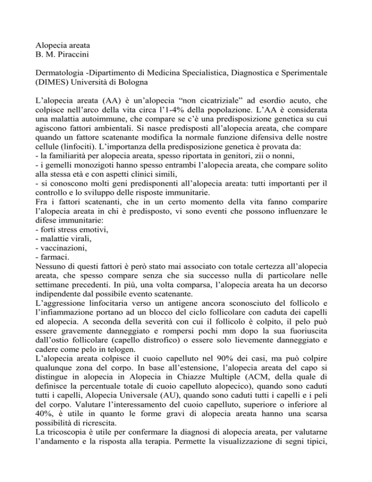 Alopecia areata B. M. Piraccini Dermatologia -Dipartimento di Medicina Specialistica, Diagnostica e Sperimentale (DIMES) Università di Bologna L’alopecia areata (AA) è un’alopecia “non cicatriziale” ad esordio acuto, che colpisce nell’arco della vita circa l’1-4% della popolazione. L’AA è considerata una malattia autoimmune, che compare se c’è una predisposizione genetica su cui agiscono fattori ambientali. Si nasce predisposti all’alopecia areata, che compare quando un fattore scatenante modifica la normale funzione difensiva delle nostre cellule (linfociti). L’importanza della predisposizione genetica è provata da: - la familiarità per alopecia areata, spesso riportata in genitori, zii o nonni, - i gemelli monozigoti hanno spesso entrambi l’alopecia areata, che compare solito alla stessa età e con aspetti clinici simili, - si conoscono molti geni predisponenti all’alopecia areata: tutti importanti per il controllo e lo sviluppo delle risposte immunitarie. Fra i fattori scatenanti, che in un certo momento della vita fanno comparire l’alopecia areata in chi è predisposto, vi sono eventi che possono influenzare le difese immunitarie: - forti stress emotivi, - malattie virali, - vaccinazioni, - farmaci. Nessuno di questi fattori è però stato mai associato con totale certezza all’alopecia areata, che spesso compare senza che sia successo nulla di particolare nelle settimane precedenti. In più, una volta comparsa, l’alopecia areata ha un decorso indipendente dal possibile evento scatenante. L’aggressione linfocitaria verso un antigene ancora sconosciuto del follicolo e l’infiammazione portano ad un blocco del ciclo follicolare con caduta dei capelli ed alopecia. A seconda della severità con cui il follicolo è colpito, il pelo può essere gravemente danneggiato e rompersi pochi mm dopo la sua fuoriuscita dall’ostio follicolare (capello distrofico) o essere solo lievemente danneggiato e cadere come pelo in telogen. L’alopecia areata colpisce il cuoio capelluto nel 90% dei casi, ma può colpire qualunque zona del corpo. In base all’estensione, l’alopecia areata del capo si distingue in alopecia in Alopecia in Chiazze Multiple (ACM, della quale di definisce la percentuale totale di cuoio capelluto alopecico), quando sono caduti tutti i capelli, Alopecia Universale (AU), quando sono caduti tutti i capelli e i peli del corpo. Valutare l’interessamento del cuoio capelluto, superiore o inferiore al 40%, è utile in quanto le forme gravi di alopecia areata hanno una scarsa possibilità di ricrescita. La tricoscopia è utile per confermare la diagnosi di alopecia areata, per valutarne l’andamento e la risposta alla terapia. Permette la visualizzazione di segni tipici, quali gli yellow dots, presenti nel 95% dai casi, che corrispondono ad osti follicolari dilatati e appaiono come punti di colorito giallo-rosa, monomorfi, rotondeggianti. Possono essere vuoti o contenere capelli sia distrofici che in ricrescita. Altri segni tipici, ma non esclusivi dell’ alopecia areata, sono i capelli cadaverizzati o black dots, punti neri monomorfi di forma rotondeggiante, presenti in tutta la chiazza alopecica in fase acuta. Si associano spesso capelli corti spezzati (distrofici), sempre indicativi di danno acuto. Esclusivi dell’alopecia areata sono invece i peli a punto esclamativo, visibili ai margini della chiazza, con la parte prossimale più sottile e più chiara rispetto a quella distale che è scura, spessa e frastagliata. La storia naturale dell’alopecia areata è imprevedibile. Circa il 40% dei pazienti con alopecia areata recupererà i capelli entro 1 anno dalla comparsa, e il 20% progredirà alla perdita totale dei capelli, di cui pieno recupero è insolito (10%). Sono frequenti le ricrescite spontanee, ma anche le recidive. I farmaci oggi disponibili per l’alopecia areata possono indurre la ricrescita dei capelli, ma non cambiano la prognosi a lungo termine della malattia. Purtroppo, solo pochi di questi trattamenti sono stati testati in studi clinici controllati con placebo. La scelta del trattamento è effettuata in base all’età del paziente, alla gravità dell’alopecia areata (interessamento del cuoio capelluto > o < al 40%) e alla sua fase di attività, valutabile con la tricoscopia.