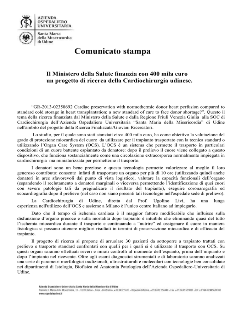 Comunicato stampa Il Ministero della Salute finanzia con 400 mila euro un progetto di ricerca della Cardiochirurgia udinese. “GR-2013-02358692 Cardiac preservation with normothermic donor heart perfusion compared to standard cold storage in heart transplantation: a new standard of care to face donor shortage?”. Questo il tema della ricerca finanziata dal Ministero della Salute e dalla Regione Friuli Venezia Giulia alla SOC di Cardiochirurgia dell’Azienda Ospedaliero Universitaria “Santa Maria della Misericordia” di Udine nell'ambito del progetto della Ricerca Finalizzata/Giovani Ricercatori. Lo studio, per il quale sono stati stanziati circa 400 mila euro, ha come obiettivo la valutazione del grado di protezione miocardica del cuore da utilizzare per il trapianto trasportato con la tecnica standard o utilizzando l’Organ Care System (OCS). L’OCS è un sistema che permette il trasporto in particolari condizioni di un cuore battente espiantato da donatore: dopo il prelievo il cuore viene collegato a questo dispositivo, che funziona sostanzialmente come una circolazione extracorporea normalmente impiegata in cardiochirurgia ma miniaturizzata per permetterne il trasporto. I donatori sono un bene prezioso e questa tecnologia permette valorizzare al meglio il loro generoso contributo: consente infatti di trasportare un organo per più di 10 ore (utilizzando quindi anche donatori in aree sfavorevoli dal punto di vista logistico), valutare la capacità funzionali dell’organo (espandendo il reclutamento a donatori marginali o viceversa permettendo l’identificazione di quei cuori con severe patologie tali da pregiudicare il risultato del trapianto), eseguire coronarografia ed ecocardiografia dopo il prelievo (nel caso non siano presenti tali tecnologie nell'ospedale sede di prelievo). La Cardiochirurgia di Udine, diretta dal Prof. Ugolino Livi, ha una esperienza nell'utilizzo dell’OCS e assieme a Milano è l’unico centro Italiano ad impiegarlo. lunga Dato che il tempo di ischemia cardiaca è il maggior fattore modificabile che influisce sulla disfunzione d’organo precoce e sulla mortalità dopo trapianto è intuibile che eliminando quasi del tutto l’ischemia miocardica durante il trasporto e continuando a “nutrire” ed ossigenare il cuore in maniera fisiologica si possano ottenere migliori risultati in termini di preservazione miocardica e di efficacia del trapianto. Il progetto di ricerca si propone di arruolare 30 pazienti da sottoporre a trapianto trattati con prelievo e trasporto standard confrontati con quelli per i quali si è utilizzato il trasporto con OCS. Su questi organi saranno effettuati severi e mirati controlli al momento dell’espianto, prima dell’impianto e dopo l’impianto nel ricevente. Oltre agli esami diagnostici strumentali e di laboratorio saranno analizzati una serie di parametri morfologici tradizionali, ultrastrutturali e molecolari con tecnologie ben consolidate nei dipartimenti di Istologia, Biofisica ed Anatomia Patologica dell’Azienda Ospedaliero-Universitaria di Udine. La ricerca avrà importanti ripercussioni cliniche organizzative perché, nel caso possa essere dimostrata una migliore preservazione miocardica con l’impiego della tecnologia OCS, questa dovrebbe essere considerata il “gold standard” e quindi la soluzione ottimale per il trasporto dell’organo nel trapianto cardiaco; viceversa se non fosse dimostrata la superiorità di questa tecnologia, che è molto costosa, la stessa dovrebbe essere impiegata solo in casi molto specifici e selezionati, come per esempio gli organi con tempo di ischemia maggiore di 3,5 ore. dott. Luigino Saccavini Tel 320 4205399 [email protected]