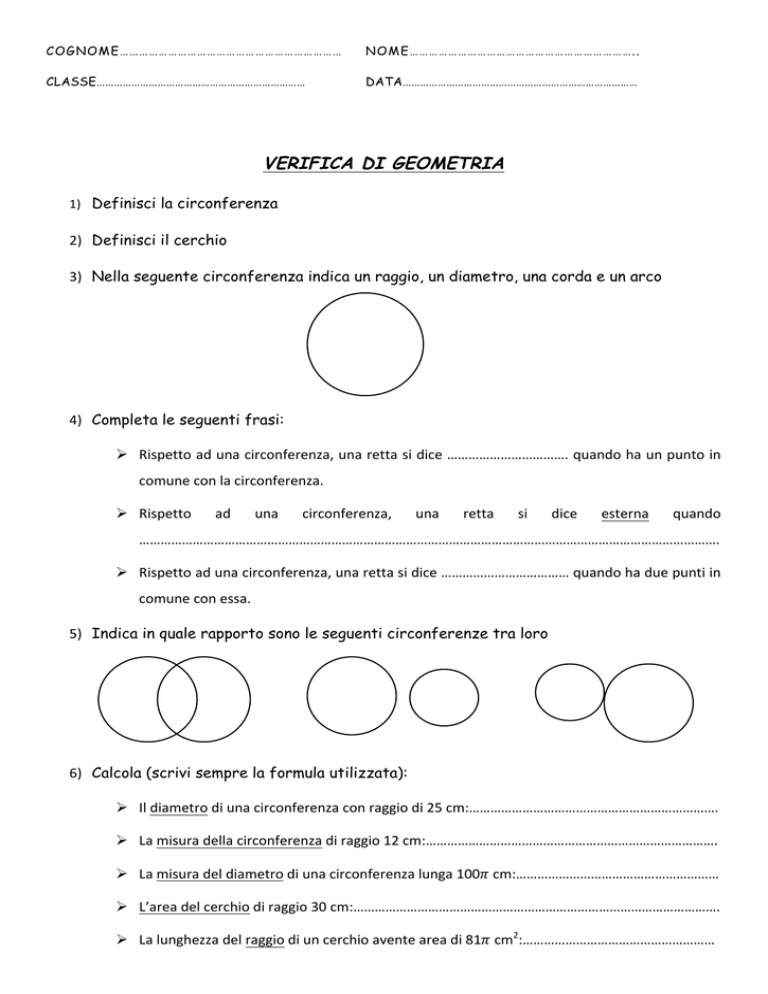 COGNOME…………………………………………………………… NOME…………………………………………………………….. CLASSE……………………………………………………………… DATA……………………………………………………………………… VERIFICA DI GEOMETRIA 1) Definisci la circonferenza 2) Definisci il cerchio 3) Nella seguente circonferenza indica un raggio, un diametro, una corda e un arco 4) Completa le seguenti frasi: Ø Rispetto ad una circonferenza, una retta si dice ……………………………. quando ha un punto in comune con la circonferenza. Ø Rispetto ad una circonferenza, una retta si dice esterna quando ………………………………………………………………………………………………………………………………………………. Ø Rispetto ad una circonferenza, una retta si dice ……………………………… quando ha due punti in comune con essa. 5) Indica in quale rapporto sono le seguenti circonferenze tra loro 6) Calcola (scrivi sempre la formula utilizzata): Ø Il diametro di una circonferenza con raggio di 25 cm:……………………………………………………………. Ø La misura della circonferenza di raggio 12 cm:………………………………………………………………………. Ø La misura del diametro di una circonferenza lunga 100𝜋 cm:………………………………………………… Ø L’area del cerchio di raggio 30 cm:…………………………………………………………………………………………. Ø La lunghezza del raggio di un cerchio avente area di 81𝜋 cm2:……………………………………………… 7) Risolvi i seguenti problemi: ! Ø Una circonferenza misura 8𝜋 cm. Calcola la lunghezza di una circonferenza il cui raggio è ! del raggio della prima. Ø Calcola l’area della corona circolare limitata da due circonferenze concentriche aventi l’una il raggio di 12 dm e l’altra il raggio di 15 cm. ! Ø La somma dei raggi di due circonferenze misura 15 m e il raggio di una di esse è del raggio ! dell’altra. Calcola la lunghezza delle due circonferenze e l’area dei due cerchi. Ø Sui lati di un triangolo rettangolo avente l’ipotenusa di 10 dm ed un cateto di 6 dm costruisci, esternamente al triangolo, le semicirconferenze aventi rispettivamente per diametri i tre lati. Calcola la misura del contorno della figura. (nota che il contorno è dato dalle tre semicirconferenze). Calcola poi l’area di tutta la figura.