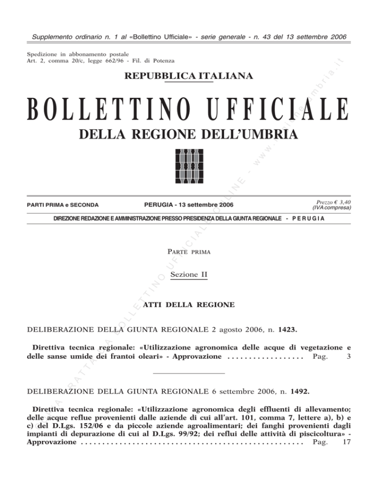 Supplemento ordinario n. 1 al «Bollettino Ufficiale» - serie generale - n. 43 del 13 settembre 2006 a .i t Spedizione in abbonamento postale Art. 2, comma 20/c, legge 662/96 - Fil. di Potenza m b ri REPUBBLICA ITALIANA g io n e .u BOLLETTI NO U F F ICI ALE L IN E - w w w .r e DELLA REGIONE DELL’UMBRIA N PERUGIA - 13 settembre 2006 O PARTI PRIMA e SECONDA Prezzo € 3,40 (IVA compresa) IC IA L E DIREZIONE REDAZIONE E AMMINISTRAZIONE PRESSO PRESIDENZA DELLA GIUNTA REGIONALE - P E R U G I A PRIMA Sezione II ATTI DELLA REGIONE O L L E T T IN O U F F PARTE A B DELIBERAZIONE DELLA GIUNTA REGIONALE 2 agosto 2006, n. 1423. R A T T A D Direttiva tecnica regionale: «Utilizzazione agronomica delle acque di vegetazione e delle sanse umide dei frantoi oleari» - Approvazione . . . . . . . . . . . . . . . . . . Pag. 3 IA T DELIBERAZIONE DELLA GIUNTA REGIONALE 6 settembre 2006, n. 1492. C O P Direttiva tecnica regionale: «Utilizzazione agronomica degli effluenti di allevamento; delle acque reflue provenienti dalle aziende di cui all’art. 101, comma 7, lettere a), b) e c) del D.Lgs. 152/06 e da piccole aziende agroalimentari; dei fanghi provenienti dagli impianti di depurazione di cui al D.Lgs. 99/92; dei reflui delle attività di piscicoltura» Approvazione . . . . . . . . . . . . . . . . . . . . . . . . . . . . . . . . . . . . . . . . . . . . . . . . . . . . Pag. 17 Supplemento ordinario n. 1 al «Bollettino Ufficiale» - serie generale - n. 43 del 13 settembre 2006 C O P IA T R A T T A D A B O L L E T T IN O U F F IC IA L E O N L IN E - w w w .r e g io n e .u m b ri a .i t 2 3 IN E - w w w .r e g io n e .u m b ri a .i t Supplemento ordinario n. 1 al «Bollettino Ufficiale» - serie generale - n. 43 del 13 settembre 2006 O N L DELIBERAZIONE DELLA GIUNTA REGIONALE 2 agosto 2006, n. 1423. C O P IA T R A T T A D A B O L L E T T IN O U F F IC IA L E Direttiva tecnica regionale: «Utilizzazione agronomica delle acque di vegetazione e delle sanse umide dei frantoi oleari» - Approvazione. Supplemento ordinario n. 1 al «Bollettino Ufficiale» - serie generale - n. 43 del 13 settembre 2006 PARTE PRIMA 6) di disporre la pubblicazione del presente atto nel Bollettino Ufficiale della Regione Umbria. t Il Relatore Rometti Sezione II .i 4 b ri a La Presidente LORENZETTI .u m ATTI DELLA REGIONE e DOCUMENTO ISTRUTTORIO n DELIBERAZIONE DELLA GIUNTA REGIONALE 2 agosto 2006, n. 1423. io Oggetto: Direttiva tecnica regionale: «Utilizzazione agronomica delle acque di vegetazione e delle sanse umide dei frantoi oleari» - Approvazione. .r e g Direttiva tecnica regionale: «Utilizzazione agronomica delle acque di vegetazione e delle sanse umide dei frantoi oleari» - Approvazione. w w Vista la L. 11 novembre 1996, n. 574, che disciplina la corretta gestione delle acque di vegetazione provenienti dai frantoi oleari, attività particolarmente significativa nella regione Umbria; Visto il D.Lgs. 3 aprile 2006, n. 152, recante «Norme in materia ambientale»; Visto il decreto del Ministero delle politiche agricole e forestali 6 luglio 2005 contenente: «Criteri e norme tecniche generali per la disciplina regionale dell’utilizzazione agronomica delle acque di vegetazione e degli scarichi dei frantoi oleari, di cui all’articolo 38 del decreto legislativo 11 maggio 1999, n. 152» pubblicato nella GU n. 166 del 19 luglio 2005; Ricordato che il comma 11 dell’art. 170 del sopra ricordato D.Lgs. 152/06 stabilisce che «fino all’emanazione di corrispondenti atti adottati in attuazione della Parte III del presente decreto, restano validi ed efficaci i provvedimenti e gli atti emanati in attuazione alle disposizioni di legge abrogati dall’art. 175»; Considerato che in ambito regionale, le attività prese in esame dalla normativa sopra richiamata sono attualmente governate dalla D.G.R. n. 1577 del 22 dicembre 2000, «Direttive tecniche provvisorie per la corretta gestione e utilizzazione agronomica dei reflui zootecnici, delle acque reflue dei frantoi oleari e dei fanghi di depurazione, al fine della salvaguardia e tutela delle acque dagli inquinamenti», così come modificata dalla D.G.R. n. 903 dell’8 giugno 2005; Ritenuto di dover procedere, ai sensi della vigente normativa, alla ridefinizione di una direttiva tecnica regionale sulla utilizzazione in agricoltura delle acque reflue provenienti dai frantoi oleari al fine di conseguire gli obiettivi posti dalle direttive comunitarie, dalla normativa statale di riferimento e soprattutto per dare una risposta agli indirizzi e ai piani della Regione in materia di gestione del territorio; Considerati gli esiti degli incontri tecnici, promossi dal IV Servizio della Direzione ambiente, territorio e infrastrutture, svoltisi con i Servizi competenti dell’Assessorato regionale all’agricoltura e con l’ARPA Umbria, nonché partecipati con le Associazioni di categoria e con l’ANCI Umbria. Tutto ciò premesso si propone alla Giunta regionale: U F F E IN L N O E L IA IC Visto il documento istruttorio concernente l’argomento in oggetto e la conseguente proposta del direttore all’ambiente, territorio e infrastrutture; Preso atto, ai sensi dell’art. 21 del regolamento interno di questa Giunta: a) del parere di regolarità tecnico-amministrativa e della dichiarazione che l’atto non comporta impegno di spesa resi dal dirigente di Servizio competente, ai sensi dell’art. 21, c. 3 e 4, del regolamento interno; b) del parere di legittimità espresso dal direttore; Vista la legge regionale 1° febbraio 2005, n. 2; Visto il regolamento interno di questa Giunta; A voti unanimi, espressi nei modi di legge, - w LA GIUNTA REGIONALE IN O delibera: C O P IA T R A T T A D A B O L L E T T 1) di fare proprio il documento istruttorio e la conseguente proposta del direttore, corredati dai pareri di cui all’art. 21 del regolamento interno della Giunta, che si allegano alla presente deliberazione, quale parte integrante e sostanziale, rinviando alle motivazioni in essi contenute; 2) d