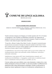BLSD – (Basic Life Support – Defibrillation) RCP (Rianimazione Cardio Polmonare) PRIMA PARTE BLSD – (Basic Life Support – Defibrillation) RCP (Rianimazione Cardio Polmonare) OBIETTIVO AFFRONTARE E TRATTARE L’ACC (Arresto Cardio Circolatorio) Blocco improvviso della funzione di pompa del cuore CONSEGUENZE 1° Le cellule celebrali (neuroni), senza l’afflusso del sangue che gli porta l’O perdono le loro funzioni entro 4-5 minuti e diventano irreversibili al massimo entro 10 minuti. 2° Le cellule del cuore (cardiomiociti), per quanto più resistenti vanno incontro al blocco della loro funzione e quindi diventano incapaci di garantire la contrazione del muscolo cardiaco e del circolo. APPROFONDIMENTO Il sangue arriva al muscolo cardiaco attraverso le arterie coronariche. LA FABBRICA: CUORE Il cuore è essenzialmente una pompa muscolare. Pesa mediamente: •300 grammi nell’uomo •250 grammi nella donna Nelle condizioni di normalità, durante il sonno, pompa 5 litri di sangue al minuto, ma già con una attività fisica moderata può arrivare a pompare 20 litri al minuto Il cuore si contrae sfruttando l’energia prodotta dalla ossidazione di sostanze energetiche (grassi, carboidrati) in presenza di ossigeno. Una parte del miocardio, è detto miocardio specifico ed è dedicato solo alla generazione e conduzione degli impulsi attraverso tutto il muscolo cardiaco consentendo al cuore di battere (contrarsi) in maniera efficiente e coordinata PERCORSI ELETTRICI NEL CUORE NODO SENO-ATRIALE NODO ATRIO-VENTRICOLARE FASCIO DI HIS BRANCA DESTRA BRANCA SINISTRA RETE DI PURKINJE CAUSE DELL’ARRESTO CARDIO CIRCOLATORIO TUTTE LE CARDIOPATIE COSTITUISCONO POTENZIALE RICHIO DI ARRESTO CARDIOCIRCOLATORIO UNA DIAGNOSI PRECOCE E UNA TERAPIA RAZIONALE E MONITORATA POSSONO RIDURRE QUESTO RISCHIO SIGNIFICAMENTE LE MALATTIE DEL CUORE (CARDIOPATIE) SI DISTINGUONO IN: AQUISITE: CHE SI VERIFCANO DURANTE LA VITA CONGENITE E/O GENETICHE: PRESENTI GIA’ ALLA NASCITA CAUSE DELL’ARRESTO CARDIO CIRCOLATORIO CHE POSSONO ACCADERE CON CUORE SANO 1) TRAUMI ESTERNI DEL TORACE (COMMOTIO CORDI) 2) CORRENTE ELETTRICA (FULMINI) 3) CRISI ALLERGICHE O ANAFILATTICHE 4) INTOSSICAZIONI ACUTE 5) IPOTERMIA 6) INALAZIONE SOSTANZE TOSSICHE (CO) 7) PNX 8) IPOSSIA 9) ERRATA ASSUNZIONE DI FARMACI O SOSTANZE 10)ECCESSIVA ALIMENTAZIONE 11)TAMPONAMENTO CARDIACO 12) ECCESSIVO CALORE CON DISIDRATAZIONE ANALISI DELL’EVENTO ACC IL CUORE SI FERMA A CAUSA DI UNA GRAVE ARTMIA CHE E’ LA CONSEGUENZA FINALE DI UN EVENTO MORBOSO GENERALE. QUESTA ARITMIA SI DEFINISCE FV = FIBRILLAZIONE VENTRICOLARE E’ IN GENERE PRECEDUTA DA UNA TACHICARDIA VENTRICOLARE CHE CONSISTE IN UN AUMENTO MOLTO ELEVATO DEI BATTITI CARDIACI, CON CONSEGUENTE RAPIDO ESAURIMENTO DELLA FUNZIONE DEL CUORE. ECG NORMALE TACHICARDIA VENTRICOLARE ASISTOLIA filmato SECONDA PARTE COSA SI DEVE FARE PER AFFRONTARE QUESTA GRAVE EVENIENZA SI RICONOSCONO DUE MOMENTI ESSENZIALE: 1) IL MASSAGGIO CARDIACO ESTERNO 2) LA DEFIBRILLAZIONE ELETTRICA SEQUENZA PROCEDURALE IN ASSENZA DI DEFIBRILLATORE 1) VERIFICA DELLA SITUAZIONE AMBIENTALE (SCENARIO) 2) ACCERTAMENTO DELLO STATO DI INCOSCIENZA DELLA VITTIMA: SE CONFERMATA INCOSCIENZA – CHIAMARE AIUTO (118) 3) VERIFICA PERVIETA’ DELLE VIE AEREE 4) VERIFICA (IN TEMPI BREVISSIMI): MOTORE: MOVIMENTO – TOSSE – RESPIRO (NON ESSENZIALE) 5) LIBERAZIONE DEL TORACE DAGLI INDUMENTI 6) MASSAGGIO CARDIACO = COMPRESSIONE TORACICHE SULLA META’ DELLO STERNO PONENDO LE MANI SULLA LINEA INTERMAMMELLARE E SECONDO QUESTA PROCEDURA: - 30 COMPRESSIONI PIGIANDO LO STERNO PER 5 CM - 2 VENTILAZIONI (NON OBBLIGATORIE PER SOGGETTI NON ADDESTRATI E NON MEDICI) - EFFETTUARE 100 COMPRESSIONI AL MINUTO (MENO DI UN SECONDO TRA UNA E L’ALTRA) - PROSEGUIRE FINO ALL’ARRIVO DEI SOCCORSI SEQUENZA PROCEDURALE CON DEFIBRILLATORE PRONTAMENTE DISPONIBILE O NELLE IMMEDIATE VICINANZE - NO 118 TUTTO UGUALE FINO AL PUNTO 6…. 7) APPLICARE DEFIBBRILATORE E SEGUIRE LE ISTRUZIONI VOCALI FORNITE DALL’APPARECCHIO 1) SCENARIO .. VERIFICARE: SEMPRE ACCIAIO/FERRO SOLO CON DEFIBBRILATORE 2) 3) 4) 6) CATENA DELLA SOPRAVVIVENZA TERZA PARTE IL DEFIBRILLATORE IL DEFIBRILLATORE ESTERNO SEMIAUTOMATICO (DAE) E’ UN APPARECCHIO ELETTROMEDICALE IN GRADO DI RICONOSCERE UN RITMO CARDIACO SUL QUALE INTERVENIRE CON SHOCK ELETTRICO E GUIDA L’OPERATORE NELLA DEFIBRILLAZIONE STESSA CON SEMPLICI ISTRUZIONI VOCALI. IL DEFIBRILLATORE FUNZIONA A CORRENTE CONTINUA. LA CORRENTE CONTINUA E’ UNA CORRENTE UNIDIREZZIONALE, OVVERO A UNA SOLA POLARITA’ CHE MOSTRA NEL TEMPO UN VALORE FISSO. LA QUANTITA’ DI CORRENTE CHE REALMENTE ATTRAVERSA IL CUORE DURANTE UNA DEFIBRILLAZIONE TRANS-TORACICA E’ SOLO IL 5% DELL’ENERGIA APPLICATA ALL’ESTERNO. QUESTA ENERGIA DIPENDE DA VARI FATTORI: 1) LA RESISTENZA CHE IL TORACE OFFRE AL PASSAGGIO DELLA CORRENTE (IMPEDENZA TORACICA). L’IMPEDENZA TORACICA RAPPRESENTA PER LA CORRENTE CONTINUA CIO’ CHE LA RESISTENZA RAPPRESENTA PER LA CORRENTE ALTERNATA. 2) LA QUANTITA’ DI ENERGIA EROGATA (DA 150 A 369 J NELL’ADULTO DA 2 A 4 PER KG DI PESO NEI BAMBINI) 3) IL TEMPO DI APPLICAZIONE (DA 3 A 10 ms) 4) LA FORMA D’ONDA (I MODERNI DEF. SEMIAUTOMATICI UTILIZZANO ONDE BIFASICHE TRONCHE). ANALIZZANDO IL PRIMO ms DURANTE LA SCARICA SONO IN GRADO, MISURANDO L’IMPEDENZA TORACICA DI ADATTARE O LA DURATA O LA TENSIONE DELLA SCARICA STESSA, IN TAL MODO RIESCONO A EROGARE L’IMPULSO PIU’ EFFICIENTE PER IL SOGGETTO. UN ONDA SINUSOIDALE BIFASICA E’ UN ONDA CHE PARTE DA 0, RAGGIUNGE UN CERTO VALORE POSITIVO, RIDISCENDE PASSANDO PER LO 0 E RAGGIUNGE UN CERTO VALORE NELLA DIREZIONE OPPOSTA PER POI TORNARE A 0. UN ONDA BIFASICA E’ PIU’ TOLLERATA DI UN ONDA MONOFASICA PRODUCENDO EFFETTI MENO LESIVI SULLE MEMBRANE E SULLE CELLULE. TALI LESIONI SONO ESSENZIALMENTE DOVUTE ALL’EFFETTO JOULE, CIOE’ AL CALORE CHE UNA CORRENTE PRODUCE QUANDO ATTRAVERSA UN CONDUTTORE O UN DIELETTRICO. L’onda bifasica APPENDICE 1) LA QUANTITA’ DI ENERGIA FORNITA DA UN DEF. SI MISU