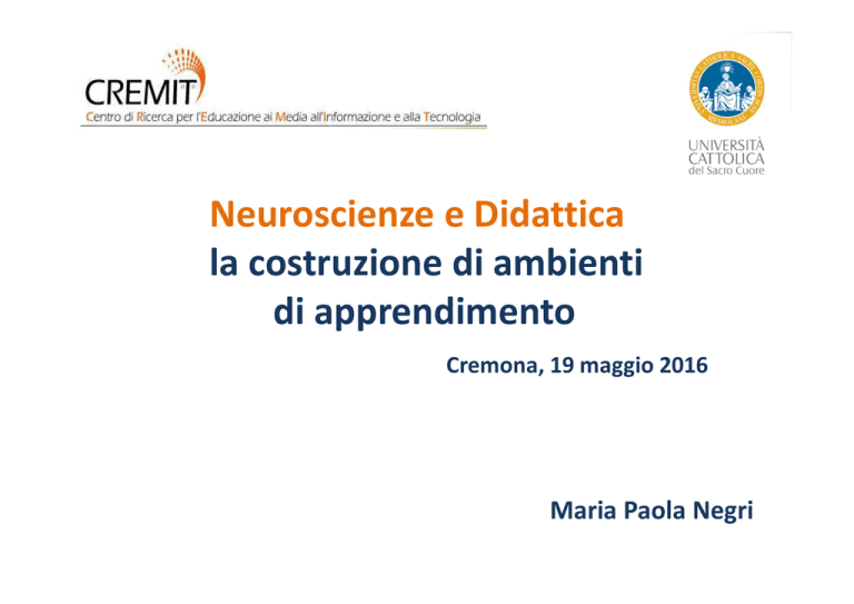 Neuroscienze e Didattica la costruzione di ambienti di apprendimento Cremona, 19 maggio 2016 Maria Paola Negri Indice Neuroscienze e Didattica Insegnare al cervello che apprende La mediazione didattica la costruzione di ambienti di apprendimento La relazione educativa La classe come gruppo di lavoro Maria Paola Negri 2 Neuroscienze e Didattica • Ogni volta che si vuol fare riferimento alle basi neurobiologiche dell’apprendimento si parla semplicemente di cervello. Di fatto quel che si vuole intendere è il «cervello incarnato». • • Da PC Rivoltella, La previsione, Neuroscienze , apprendimento, didattica, La Scuola, BS, 2014, p.8 Le slides da 4 a 21 sono tratte da questo testo e dall’intervento del prof. Rivoltella all’Accademia dei Lincei. Maria Paola Negri 3 Neuroscienze e Didattica Il principio dell’educabilità Il cervello in età evolutiva Come apprende il cervello incarnato Come insegnare al cervello incarnato Maria Paola Negri 4 Il principio dell’educabilità • In-segnare • La plasticità Maria Paola Negri 5 Lobo parietale Movimento, sensazioni Maria Paola Negri 6 Lobo parietale Movimento, sensazioni Lobo occipitale Visione Maria Paola Negri 7 Lobo parietale Movimento, sensazioni Lobo occipitale Visione Lobo temporale Emozioni, sessualità, linguaggio Maria Paola Negri 8 Lobo frontale Giudizio, intuizione, controllo degli impulsi Lobo parietale Movimento, sensazioni Lobo occipitale Visione Lobo temporale Emozioni, sessualità, linguaggio Maria Paola Negri 9 Gradiente di sviluppo Lobo frontale Giudizio, intuizione, controllo degli impulsi Lobo parietale Movimento, sensazioni Lobo occipitale Visione Lobo temporale Emozioni, sessualità, linguaggio Maria Paola Negri 10 Maria Paola Negri 11 I circuiti parietali − senso del numero, rappresentazione della quantità - Immaginazione numerica, processamento verbale delle informazioni numeriche - Memoria aritmetica, processi attenzionali Maria Paola Negri 12 I neuroni «specchio» • I processi neuropsicologici sono il meccanismo di base del nostro apprendimento • I neuroni specchio, cellule localizzate in una precisa parte del cervello (zona fronto-parietale) sono infatti capaci di reagire non soltanto ad un semplice stimolo, ma anche di ‘comprendere' il significato di quello stimolo. Maria Paola Negri 13 I neuroni «specchio» • Questa scoperta conduce a stabilire che le diverse aree cerebrali non sono, come si pensava, suddivise per eseguire distintamente compiti esecutivi e compiti di controllo, ma azione e percezione costituiscono un'unica funzione. Maria Paola Negri 14 I neuroni «specchio» • Ogni forma di apprendimento che avviene attraverso l'imitazione necessita della partecipazione di altre aree corticali • il sistema di controllo di questo processo è attuato dal sistema dei neuroni specchio, che può agire mettendo in atto un duplice controllo di tipo facilitatorio o inibitorio Maria Paola Negri 15 Maria Paola Negri 16 I modelli della mente Teoria Modello Autore Cervello come Pensare è Cognitivismo Simbolico Piaget Calcolatore Connessionismo Connessionista Rumelhart Formicaio McLelland Trattare informazioni in parallelo Cognizione incarnata Organico Varela Organismo Vivere Cognizione distribuita Situazionista Hutchins Macchina complessa Adattamento complesso a un contesto Statistica soggettiva Statistico Frith, Dehaene Macchina bayesiana Prevedere Maria Paola Negri Trattare informazioni in serie 17 Emulazione “Attività creativa del cervello, che risolve la complessità del mondo esterno producendo percezioni compatibili con le intenzioni riguardo il futuro, la memoria del passato e le leggi del mondo esterno che ha interiorizzato” (Berthoz, 2011) Maria Paola Negri 18 Analogia “Per sopravvivere, gli esseri umani si basano sulla comparazione di ciò che sta accadendo loro in questo momento con quanto è già accaduto loro in passato. (…) Il nostro povero cervello deve fare continuamente i conti con un caos non preventivabile, cercando sempre di trovare un significato per quel che lo circonda e sciama verso di esso senza un ordine preciso“ (Hofstadter, Sander, 2013) Maria Paola Negri 19 Vicarianza «La possibilità di percepire un oggetto, una parte del nostro corpo, una persona, come qualcosa o qualcuno che può servirci per fare qualcosa di differente (Berthoz, 2013)» Maria Paola Negri 20 La ricerca dell’essenziale • “afferrare l’eterno in ciò che è disperatamente fugace” (T. Williams) • Il cervello, per giungere alla conoscenza del mondo, cerca ciò che è costante ed essenziale • Ostacolo per l’apprendimento: selezionare le invarianti all’interno di una complessità ridondante di informazioni Maria Paola Negri 21 La scuola di ieri • « L’esperienza di ciò che è giusto o ingiusto appartiene a tutti noi…ogni volta che abbiamo considerato ingiusto un voto alle superiori o un castigo troppo severo…» Pier Cesare Rivoltella [Da «Le virtù del digitale» Morcelliana, BS, 2015, p.23] Maria Paola Negri 22 A scuola OGGI Maria Paola Negri 23 Le intelligenze multiple • Le dimensioni dell’intelligenza individuate da H. Gardner sono: • linguistica; • musicale; • logico-matematica; • spaziale e visiva; • corporeo-cinestetica; • sociale e interpersonale; • introspettiva o intrapersonale; • naturalistica. Maria Paola Negri 24 Insegnare al cervello che apprende • « Il nostro cervello funziona esattamente così: parte da un set di informazioni che già possiede e che sono il risultato delle sue esperienze pregresse, le corregge sulla base delle nuove esperienze» • In Rivoltella P C, La Previsione, Neuroscienze, apprendimento , didattica, La Scuola, BS, 2014, p.23 Maria Paola Negri 25 Il cervello in età evolutiva • presenta un’elevata plasticità all’apprendimento • Ha difficoltà a trovare motivazioni per lo studio • è di umore instabile (tempeste ormonali) • è guidato dalla ricerca della ricompensa immediata più che dalle mot